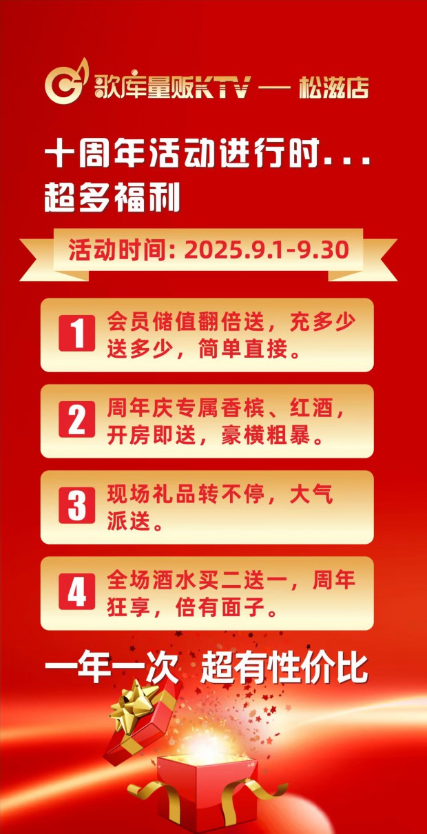 一道風景,一張名片,一份十年的溫暖守候。為感恩新老客戶長期以來的支持與厚愛,松滋市歌庫娛樂有限責任公司將于2025年9月1日至9月30日舉辦十周年慶典系列活動。活動內容包括:會員專享福利、主題歡唱派對、消費贈禮、抽獎活動等。松滋歌庫十歲啦,9月狂歡一整月。